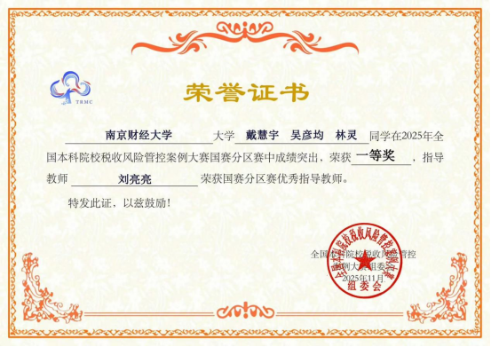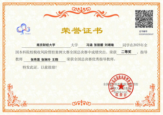 自本届全国本科院校税收风险管控案例大赛启动以来,我院领导高度重视,鼓励财税学子广泛参与、积极备赛,张秀莲副教授作为校内指导教师和领队全程负责赛事筹备、协调和指导工作。在总决赛赛场上,队员们以“建筑业的税收风险”为主题,凭借严谨的逻辑思维能力、专业精准的汇报答辩和默契的团队配合,取得优异成绩,展现了我校学子风采。 另一支由财政2302戴慧宇、财政2302吴彦均、税收2403林灵组成、由我院刘亮亮老师指导的队伍荣获省赛一等奖。